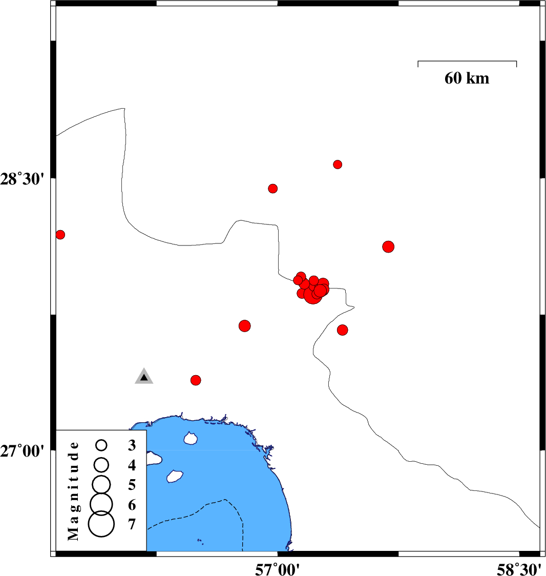 | 2017/10/26 | 09:15:13.3 | 12:45:13.3 | 27.939 | 57.126 | 14 | ML2.6 | Kerman Province, 56 km -West of Kahnuj | ||
