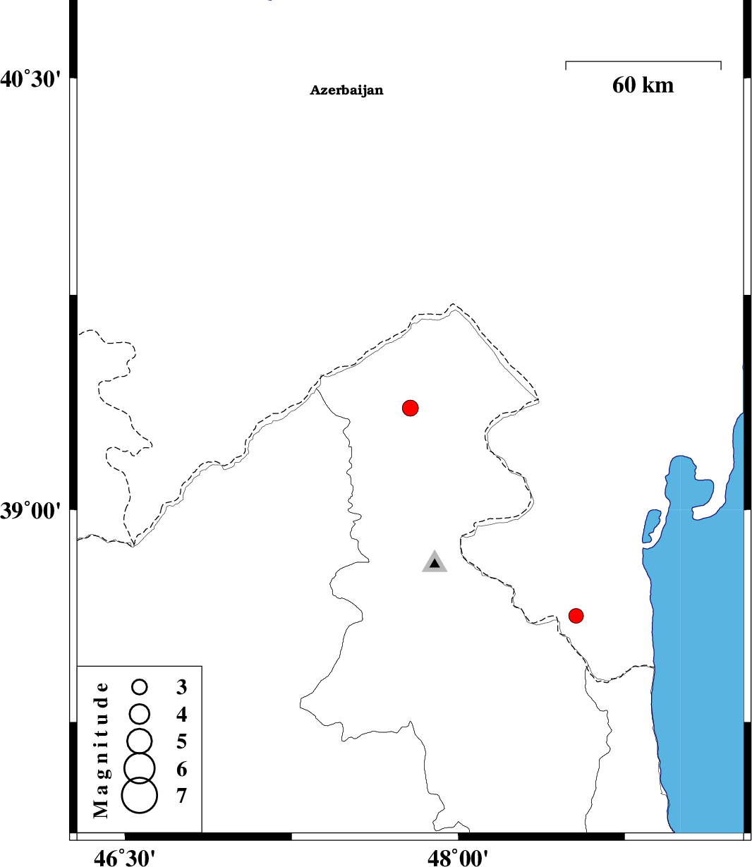 2017/10/29 | 06:51:32.0 | 10:21:32.0 | 39.356 | 47.784 | 14 | ML:3.2 | Ardebil Province, 35 km South-West of Pars Abad | ||