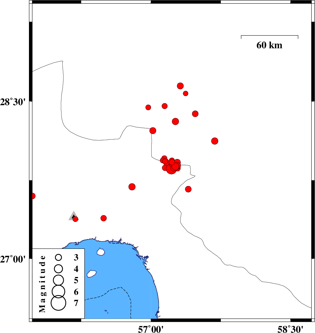 | 2017/10/20 | 08:24:52.1 | 11:54:52.1 | 28.124 | 57.686 | 18 | ML3.2 | Kerman Province, 19 km North of Kahnuj | ||