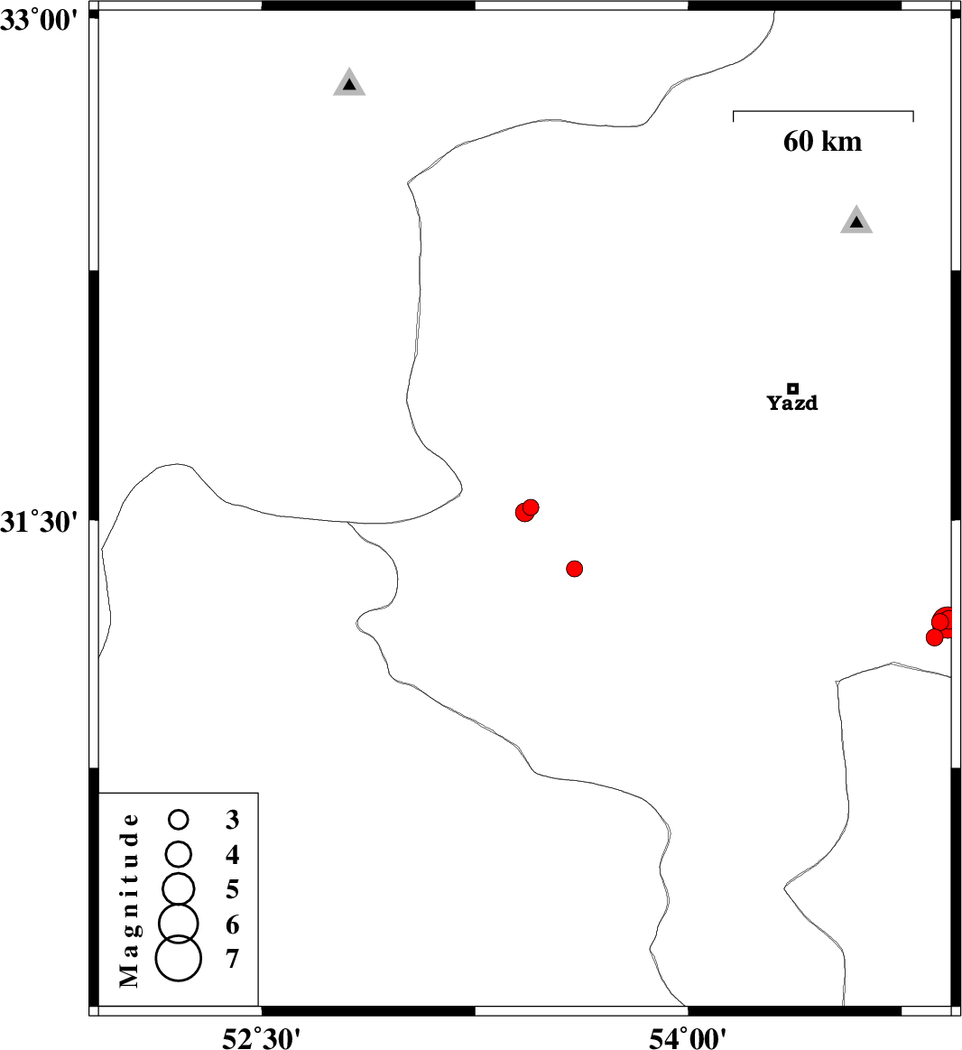 2017/10/19 | 02:41:04.7 | 06:11:04.7 | 31.193 | 54.886 | 14 | ML:2.7 | Yazd Province, 60 km South-East of Mehriz | ||