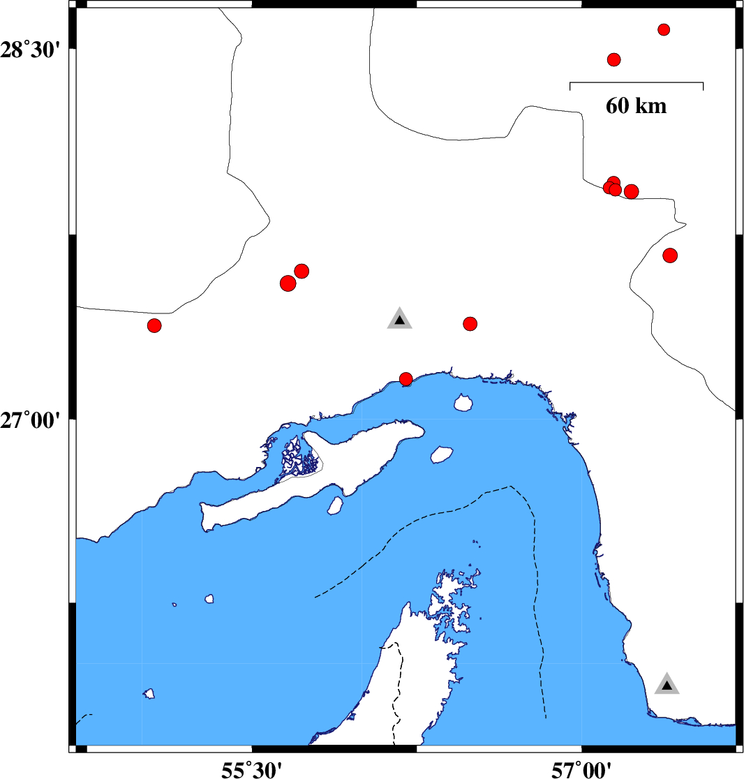 | 2017/10/26 | 09:15:13.3 | 12:45:13.3 | 27.939 | 57.126 | 14 | ML2.6 | Kerman Province, 56 km -West of Kahnuj | ||