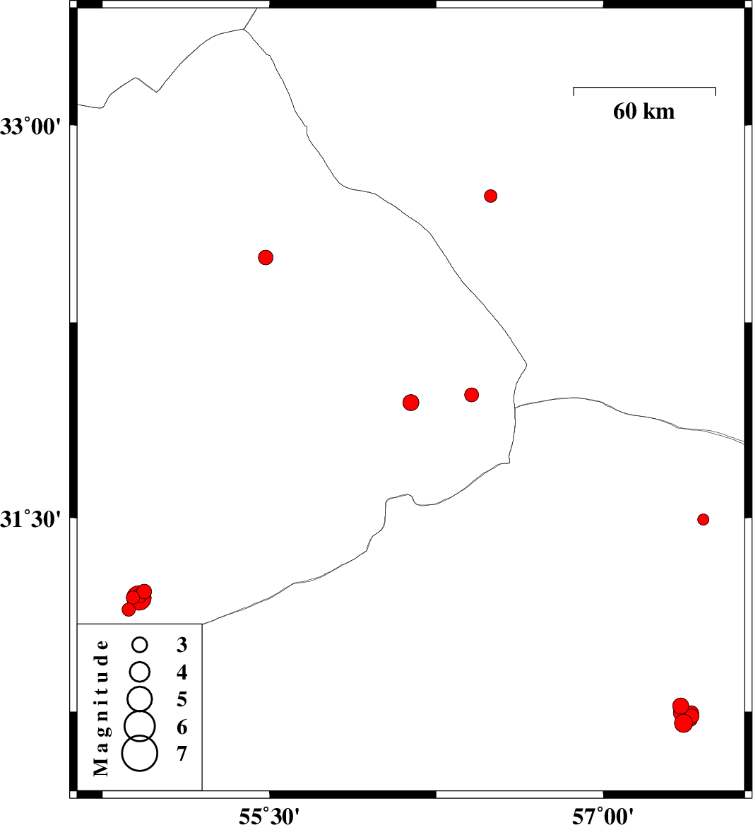 | 2017/11/06 | 21:55:14.1 | 01:25:14.1 | 30.773 | 57.348 | 6 | ML3.3 | Kerman Province, 60 km North-East of Kerman | ||