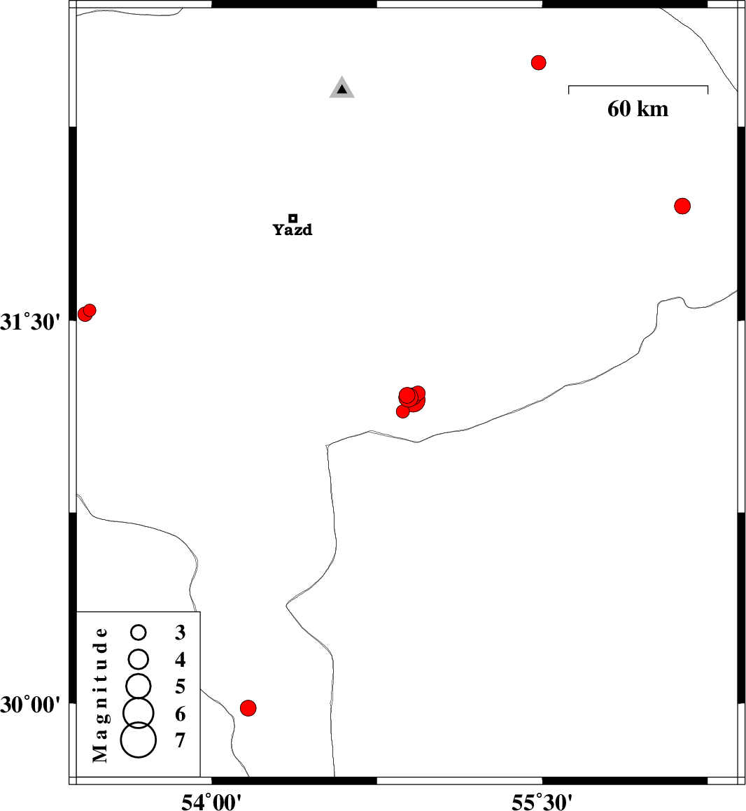2017/11/07 | 06:39:59.5 | 10:09:59.5 | 31.943 | 56.135 | 14 | ML:3.3 | Yazd Province, 79 km North-East of Bafq | ||