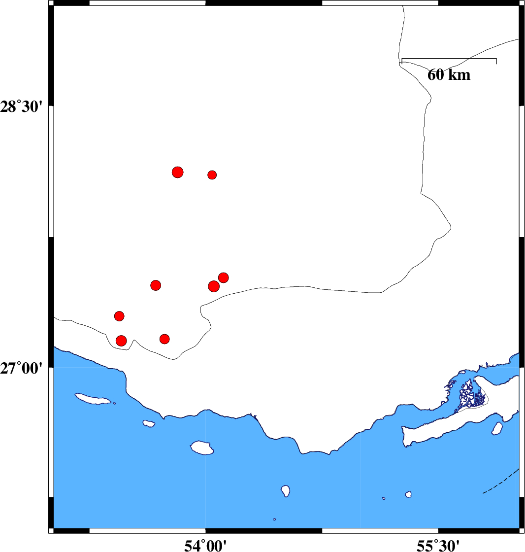 2017/10/28 | 10:04:28.1 | 13:34:28.1 | 27.381 | 55.055 | 14 | ML2.8 | Hormozgan Province, 71 km North-East of Bastak | ||
