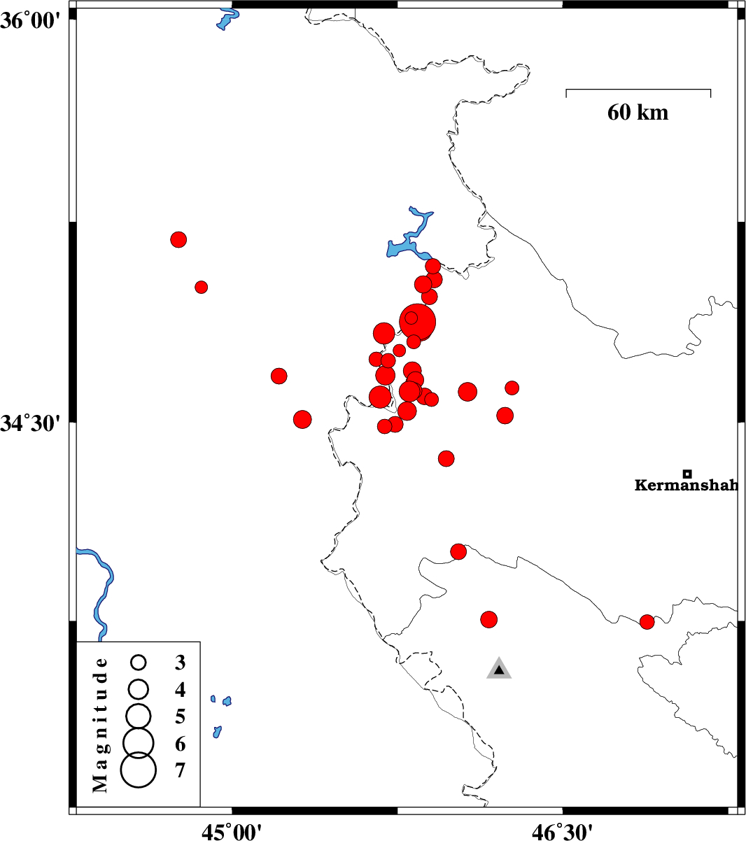 | 2017/11/12 | 20:22:59.8 | 23:52:59.8 | 34.629 | 46.27 | 14 | ML2.8 | Kermanshah Province, 28 km South-West of Javanrud | ||