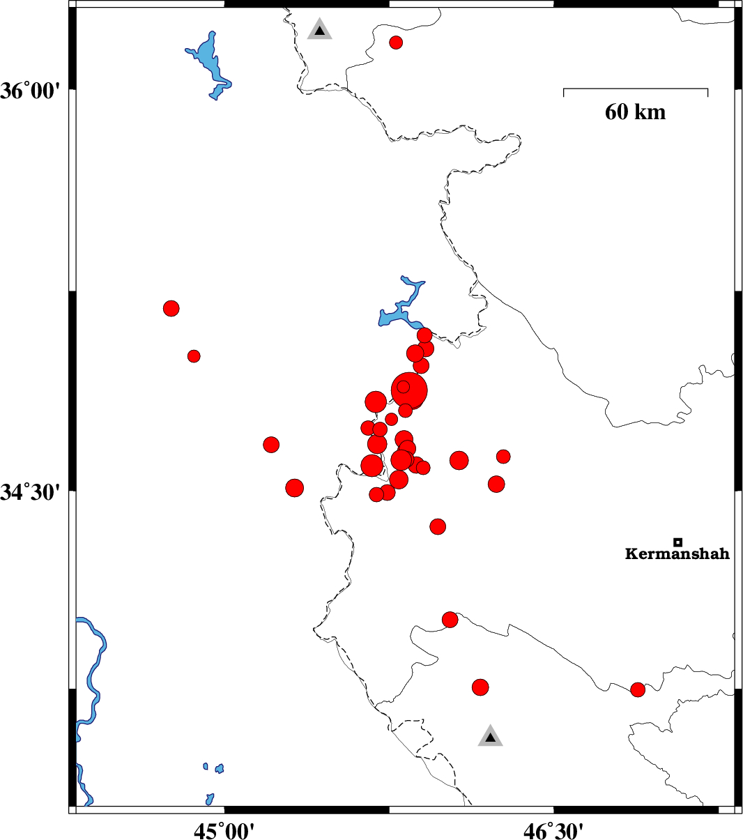 | 2017/11/12 | 20:01:51.6 | 23:31:51.6 | 34.618 | 45.824 | 14 | ML3.4 | Kermanshah Province, 16 km South of Tazehabad | ||