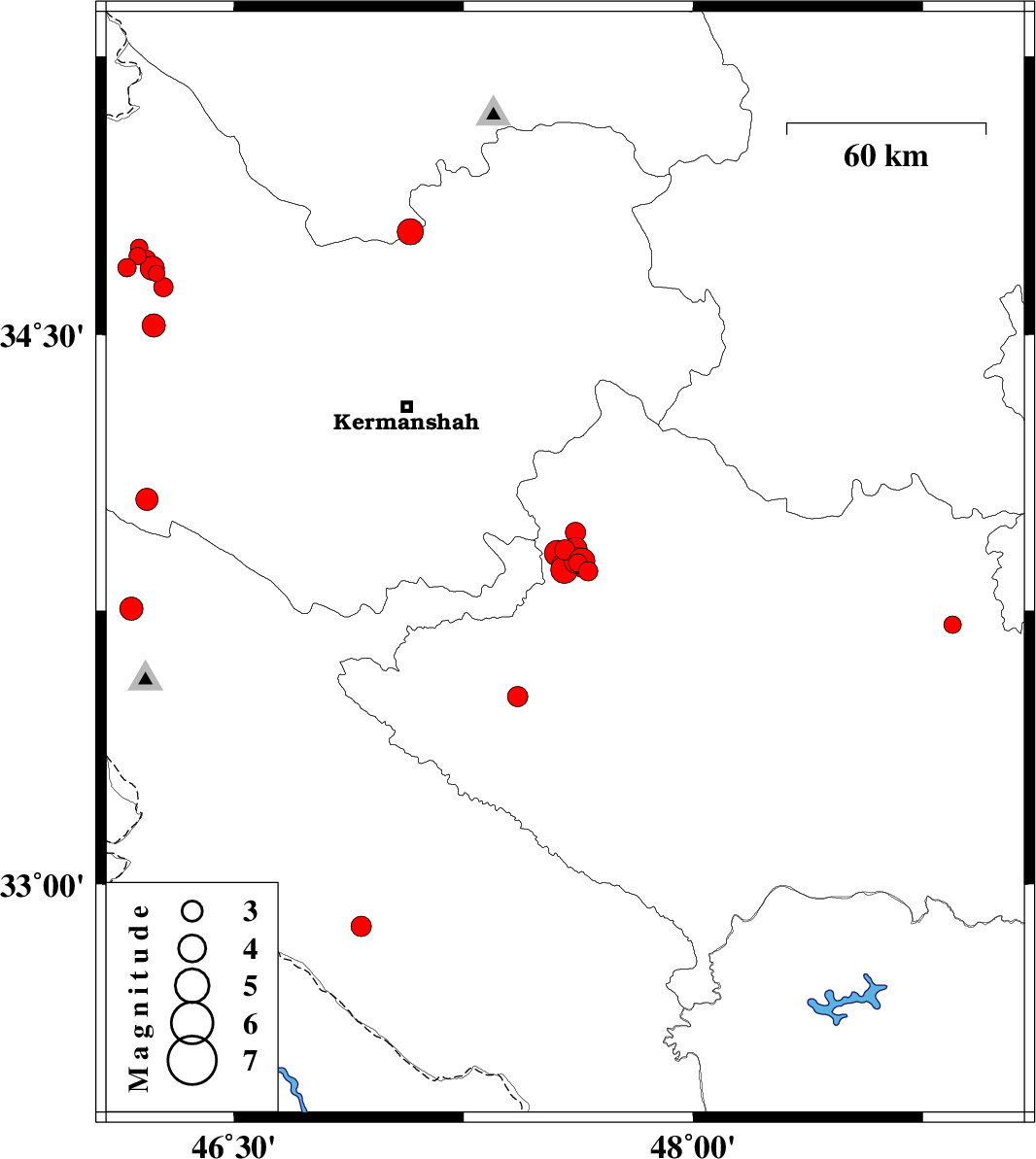 | 2017/11/12 | 20:22:59.8 | 23:52:59.8 | 34.629 | 46.27 | 14 | ML2.8 | Kermanshah Province, 28 km South-West of Javanrud | ||