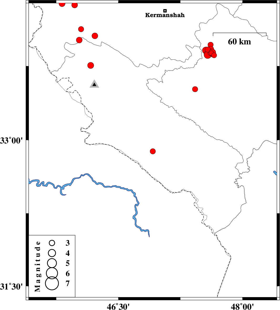 2017/11/14 | 09:40:38.5 | 13:10:38.5 | 32.884 | 46.916 | 15 | ML:3 | Ilam Province, 39 km North-West of Dehloran | ||