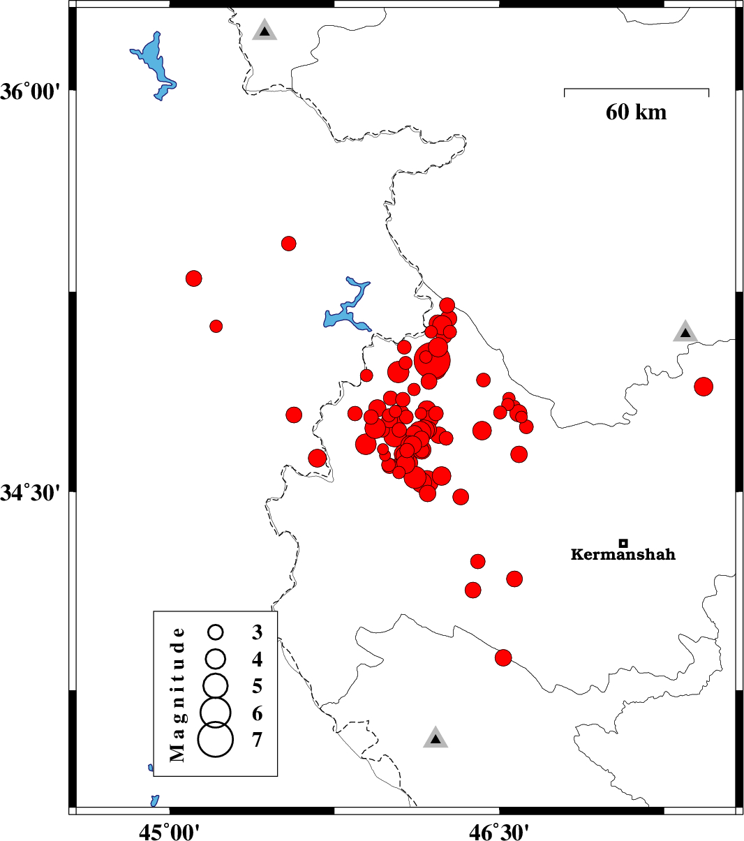 | 2017/11/12 | 18:18:17.8 | 21:48:17.8 | 34.877 | 45.841 | 18 | Mb7.3 | Kermanshah Province, 13 km North of Tazehabad | ||
