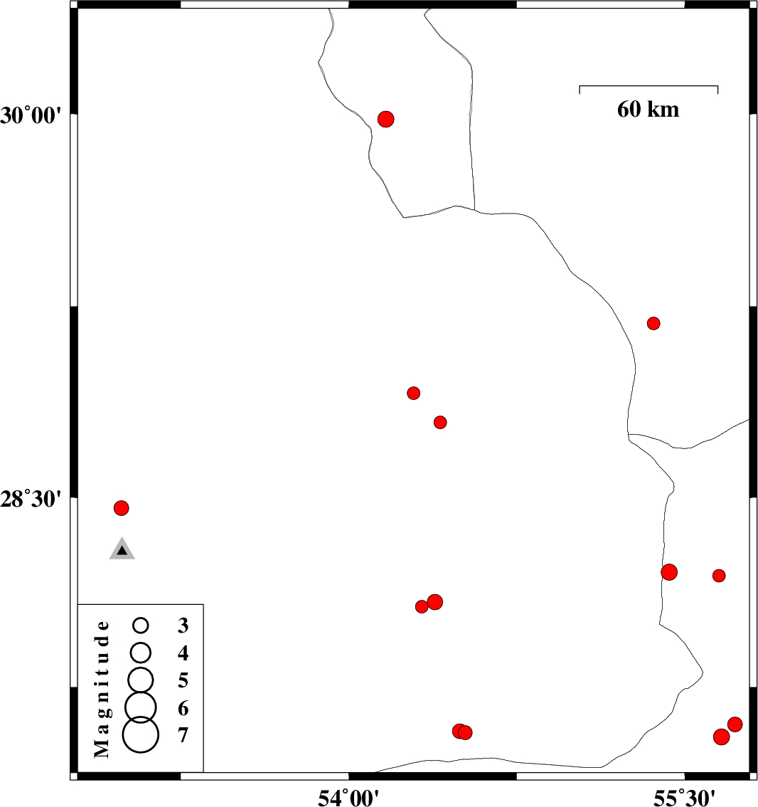 | 2017/11/15 | 00:28:13.2 | 03:58:13.2 | 28.91 | 54.289 | 14 | ML2.6 | Fars Province, 33 km South of Neyriz | ||