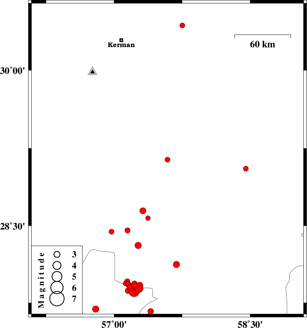 2017/10/28 | 02:31:02.4 | 06:01:02.4 | 28.455 | 57.147 | 6 | ML:2.7 | Kerman Province, 63 km South-West of Jiroft | ||