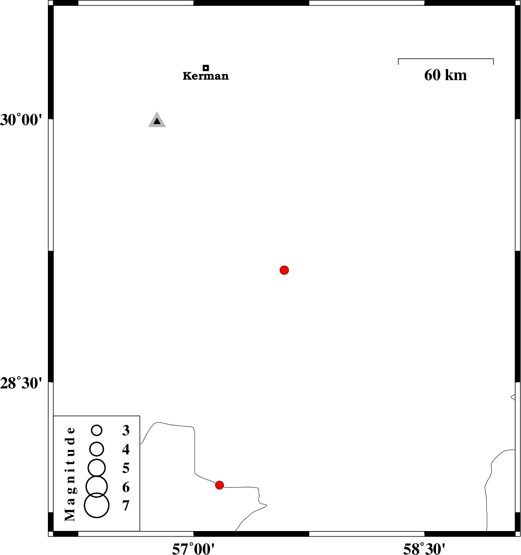 | 2017/11/12 | 20:43:56.9 | 00:13:56.9 | 29.14 | 57.588 | 14 | ML2.5 | Kerman Province, 54 km North-West of Jiroft | ||