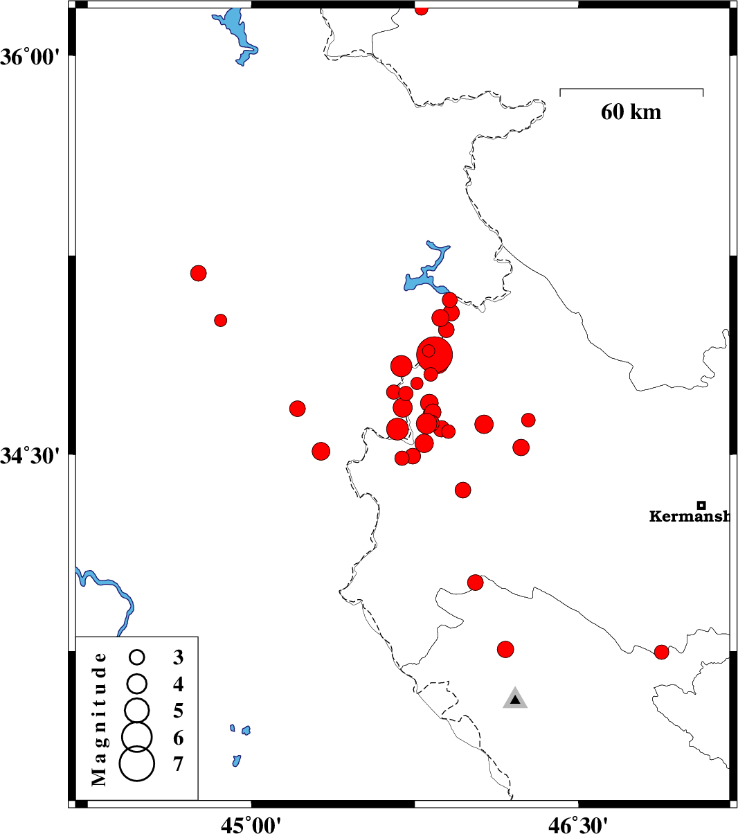 | 2017/11/12 | 20:22:59.8 | 23:52:59.8 | 34.629 | 46.27 | 14 | ML2.8 | Kermanshah Province, 28 km South-West of Javanrud | ||