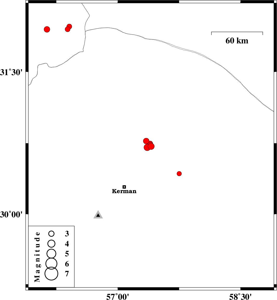 | 2017/10/20 | 13:14:36.4 | 16:44:36.4 | 30.745 | 57.396 | 18 | ML3 | Kerman Province, 59 km North-East of Kerman |
