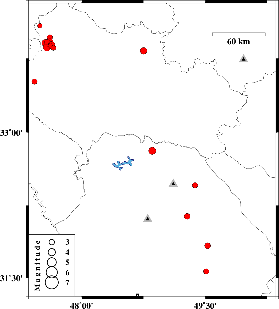 | 2017/11/13 | 10:27:22.2 | 13:57:22.2 | 33.907 | 47.557 | 17 | ML3.8 | Lorestan Province, 40 km South of Harsin |