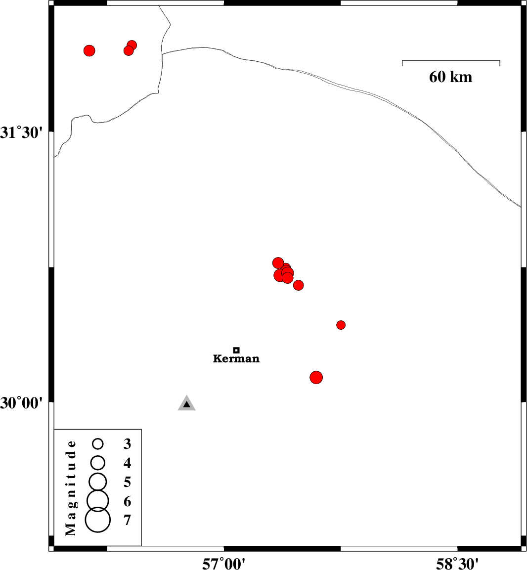 | 2017/11/19 | 13:13:29.1 | 16:43:29.1 | 30.691 | 57.408 | 14 | ML3.3 | Kerman Province, 55 km North-East of Kerman | ||