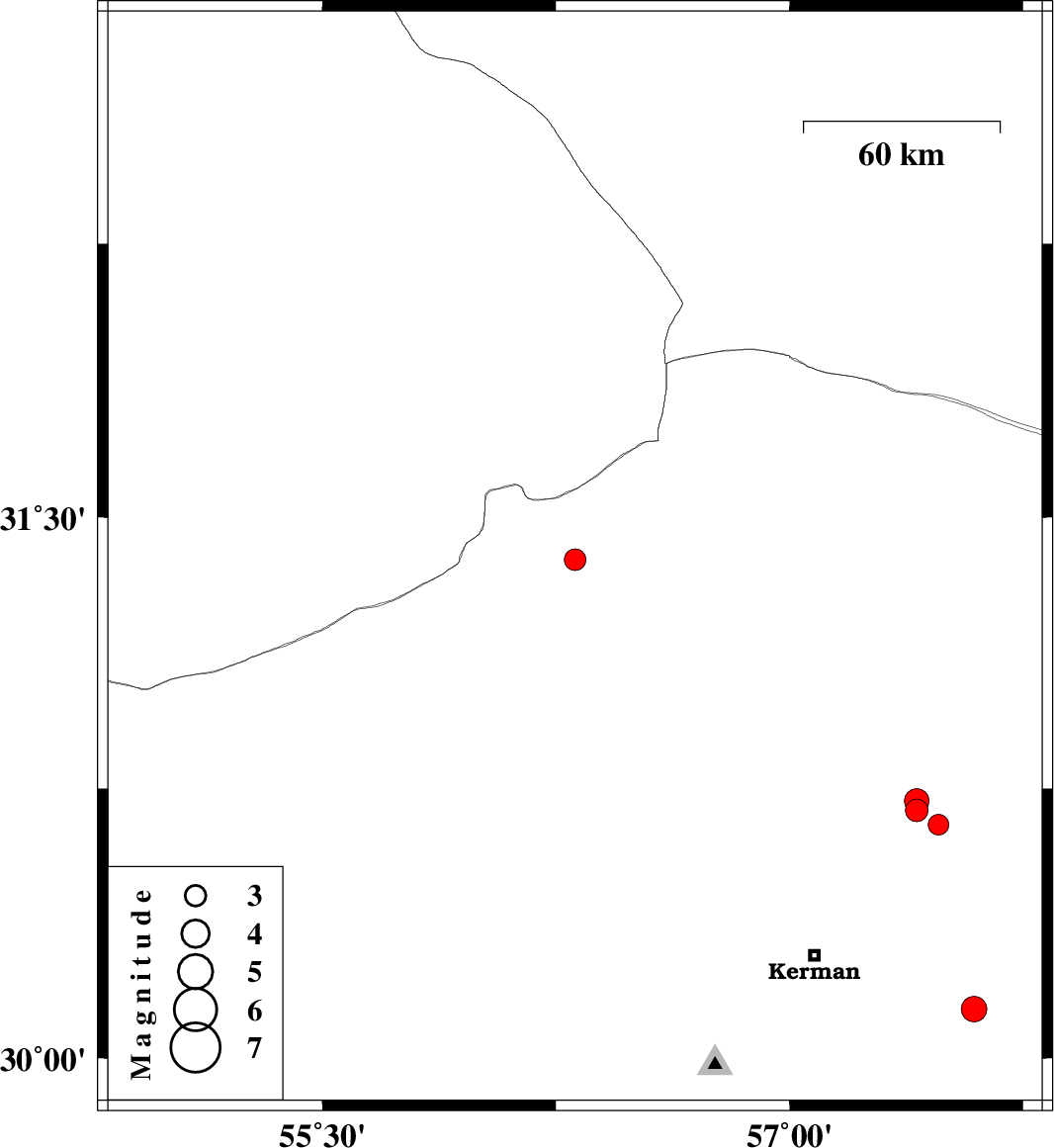 | 2017/11/19 | 13:13:29.1 | 16:43:29.1 | 30.691 | 57.408 | 14 | ML3.3 | Kerman Province, 55 km North-East of Kerman | ||