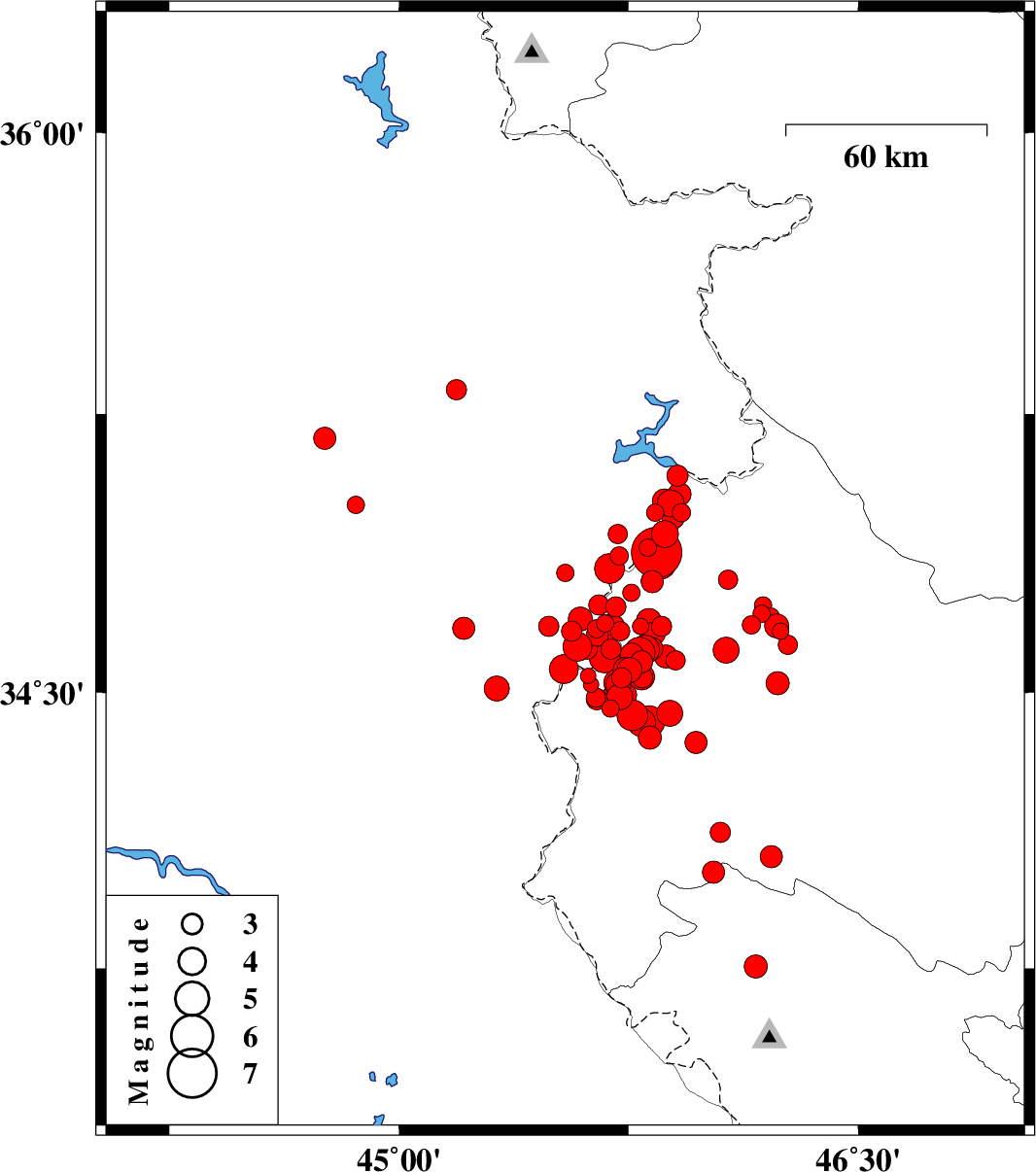 | 2017/11/12 | 18:18:17.8 | 21:48:17.8 | 34.877 | 45.841 | 18 | Mb7.3 | Kermanshah Province, 13 km North of Tazehabad | ||