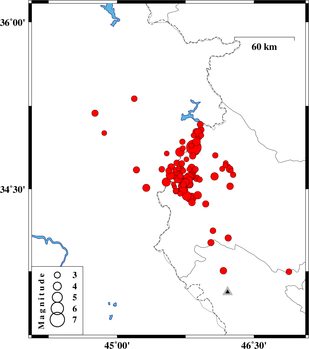 2017/11/14 | 12:35:57.9 | 16:05:57.9 | 34.617 | 45.692 | 14 | ML:3 | Iraq, 15 km North-East of Qasr-E-Shirin | ||