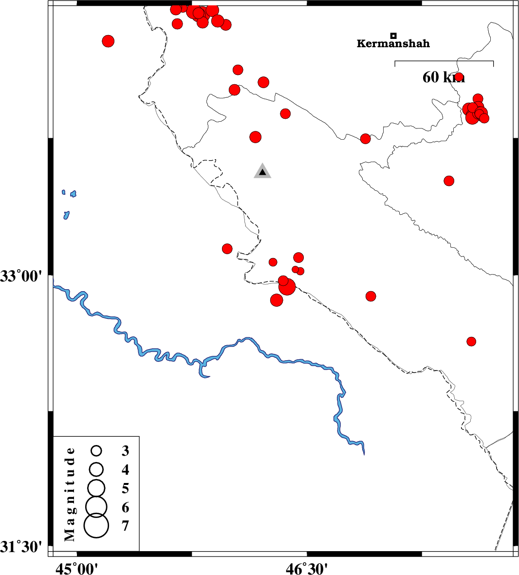 2017/11/20 | 15:23:40.5 | 18:53:40.5 | 32.936 | 46.371 | 14 | ML:5 | , 28 km South-East of Mehran | ||