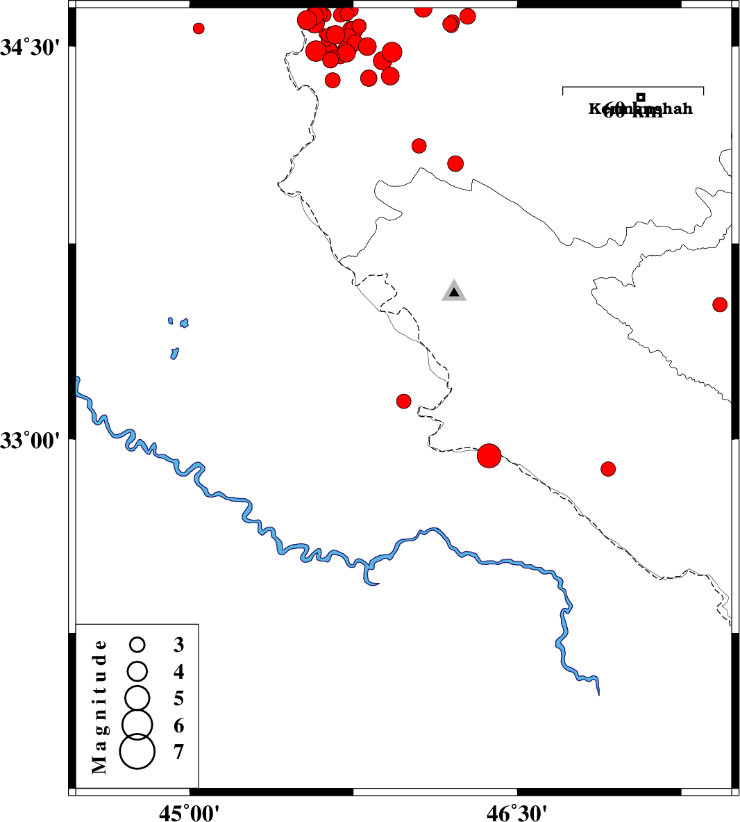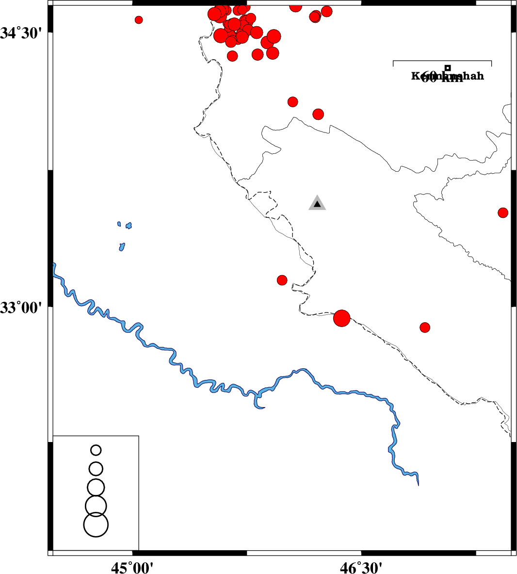 | 2017/11/18 | 02:52:54.1 | 06:22:54.1 | 34.592 | 46.202 | 15 | ML3 | Kermanshah Province, 32 km North-East of Sar-e pol-e zahab | ||