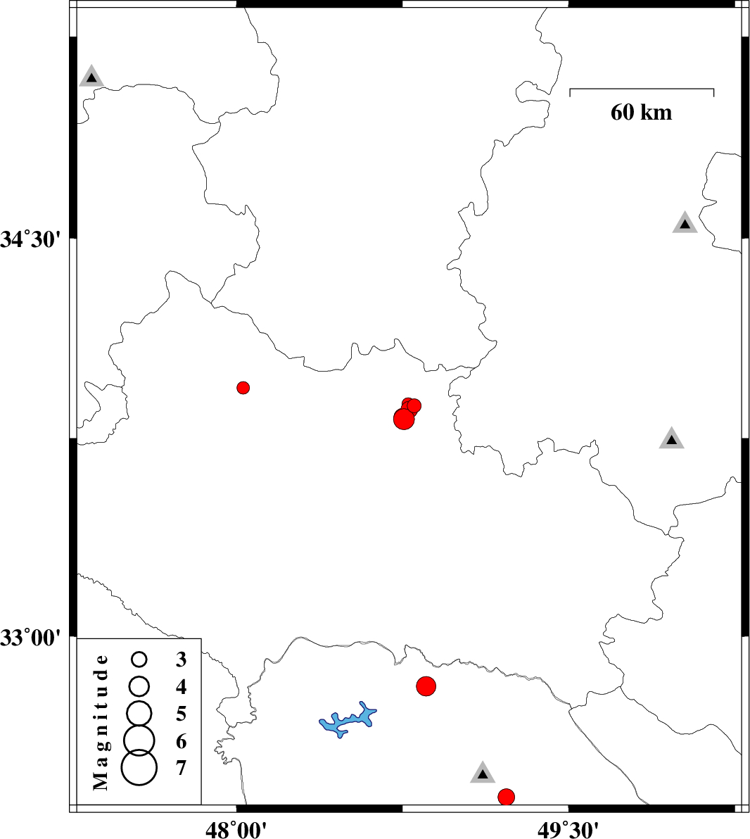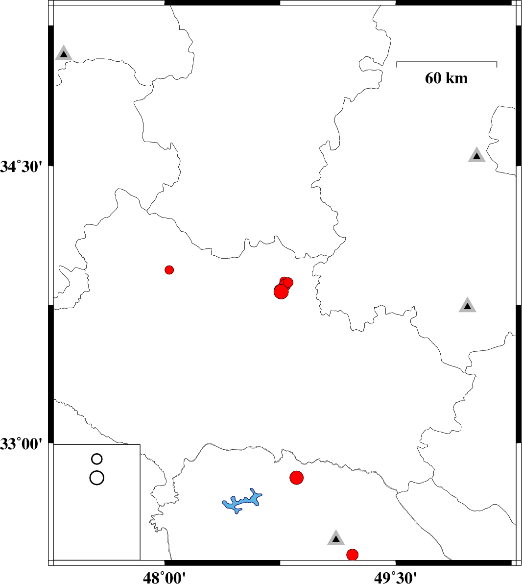 | 2017/11/21 | 05:52:32.8 | 09:22:32.8 | 33.94 | 48.031 | 16 | ML2.6 | Lorestan Province, 16 km South of Nurabad | ||