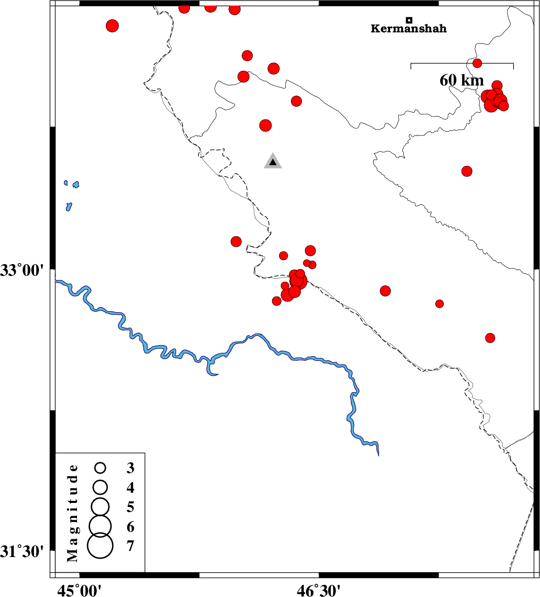 | 2017/11/15 | 06:00:19.7 | 09:30:19.7 | 34.082 | 47.492 | 17 | ML2.6 | Lorestan Province, 22 km South of Harsin | ||