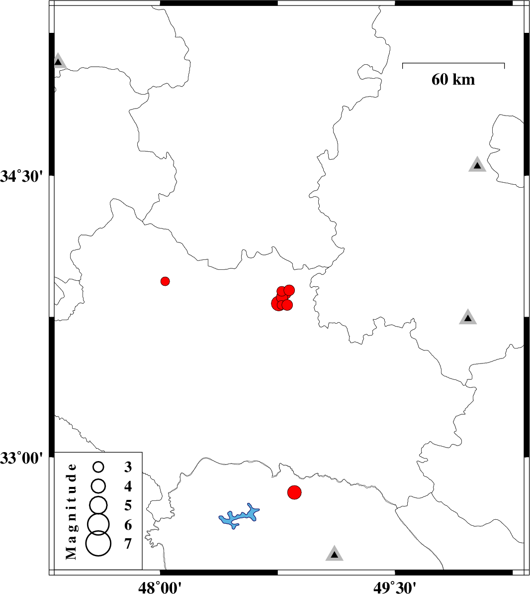 | 2017/11/21 | 05:52:32.8 | 09:22:32.8 | 33.94 | 48.031 | 16 | ML2.6 | Lorestan Province, 16 km South of Nurabad | ||