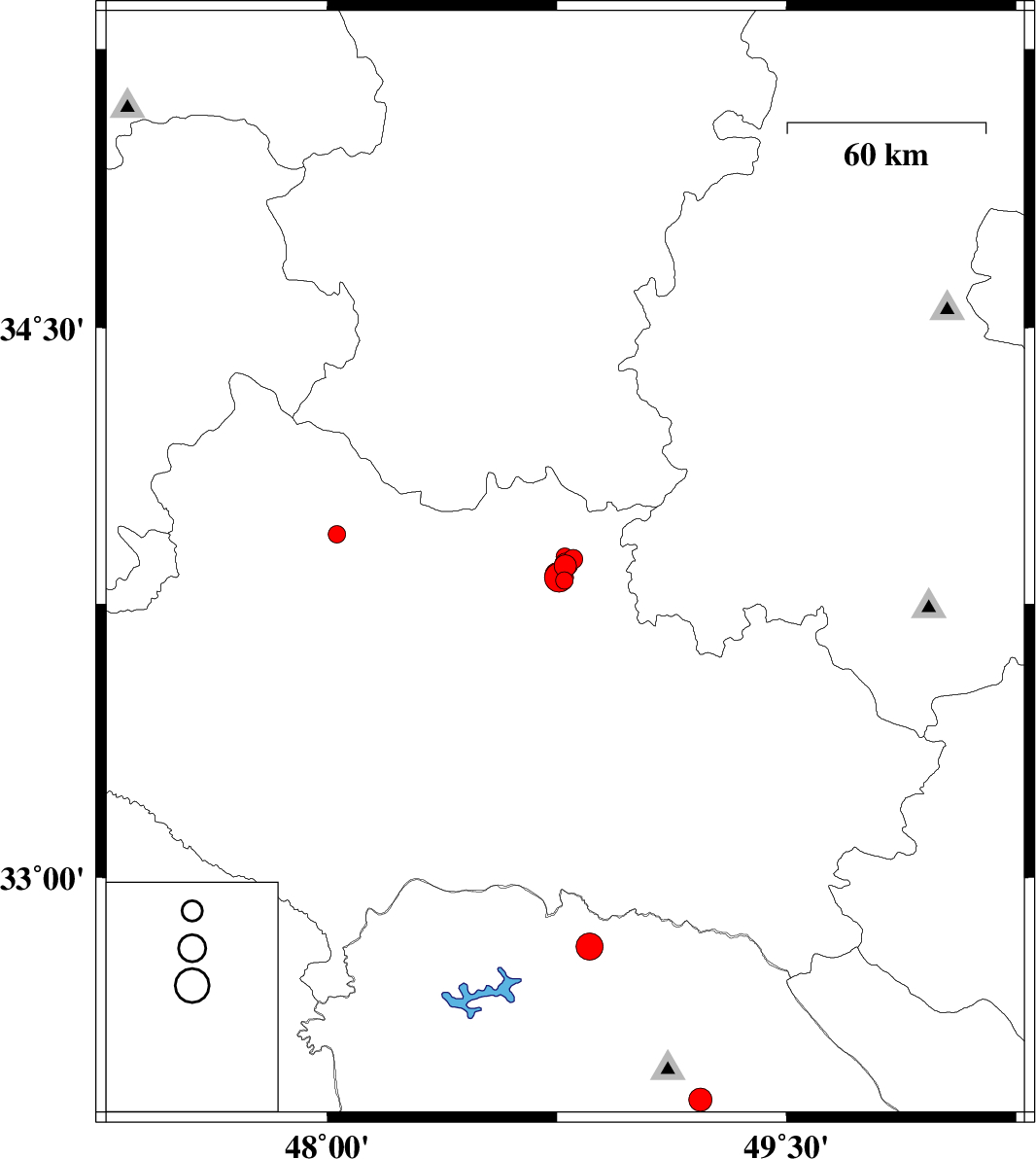 | 2017/11/23 | 08:47:03.6 | 12:17:03.6 | 33.857 | 48.78 | 15 | ML3.4 | Lorestan Province, 5 km of Borujerd | ||