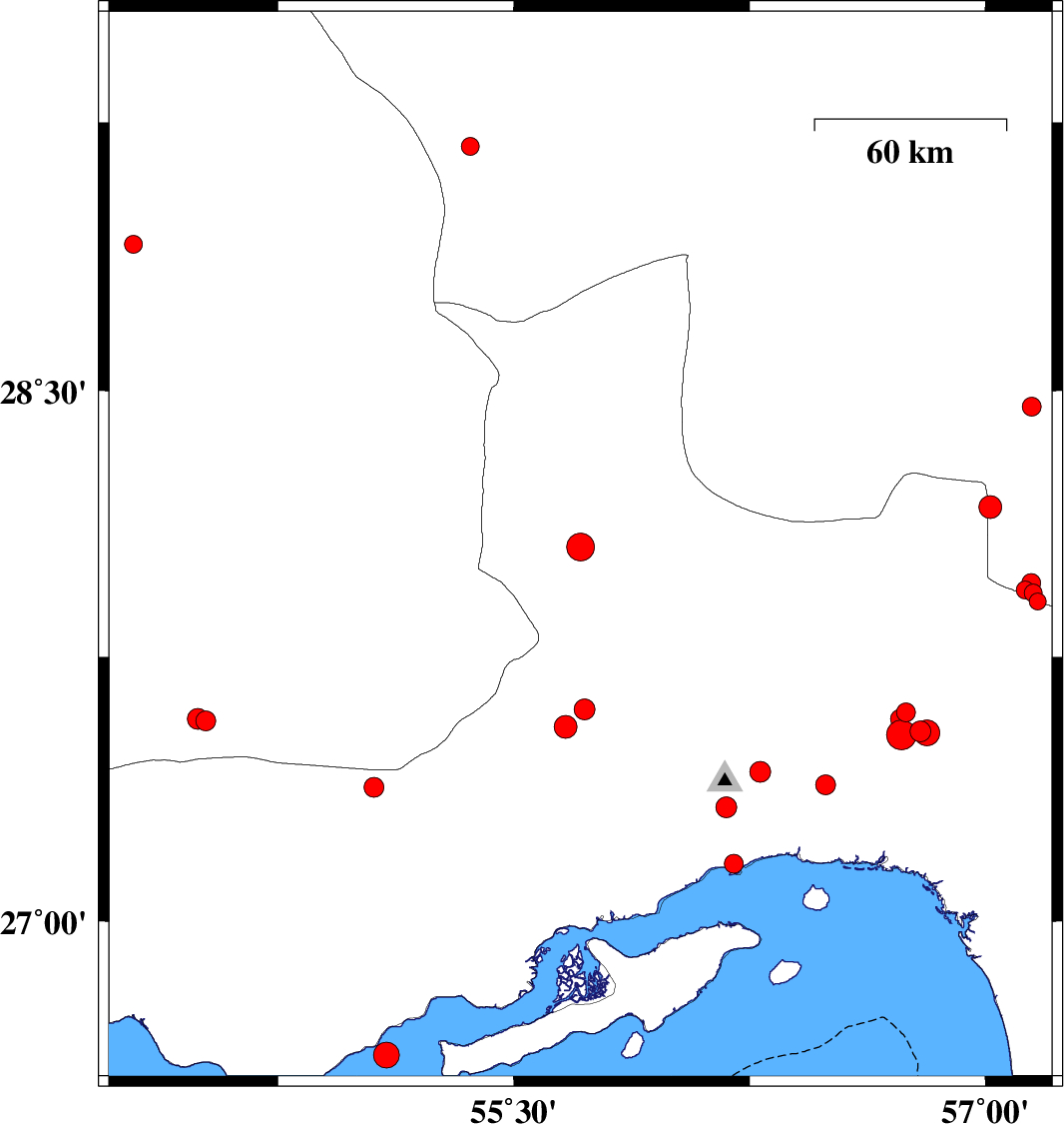2017/10/28 | 10:04:28.1 | 13:34:28.1 | 27.381 | 55.055 | 14 | ML:2.8 | Hormozgan Province, 71 km North-East of Bastak | ||
