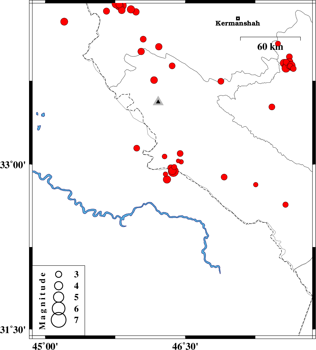 | 2017/11/15 | 06:00:19.7 | 09:30:19.7 | 34.082 | 47.492 | 17 | ML2.6 | Lorestan Province, 22 km South of Harsin | ||