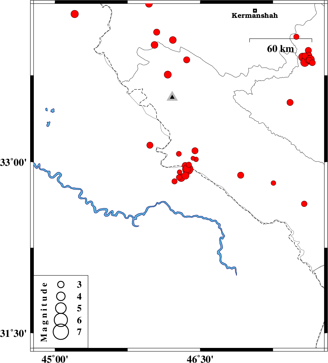| 2017/11/23 | 04:39:44.2 | 08:09:44.2 | 32.911 | 46.287 | 18 | ML2.3 | Iraq, 26 km South-East of Mehran | ||