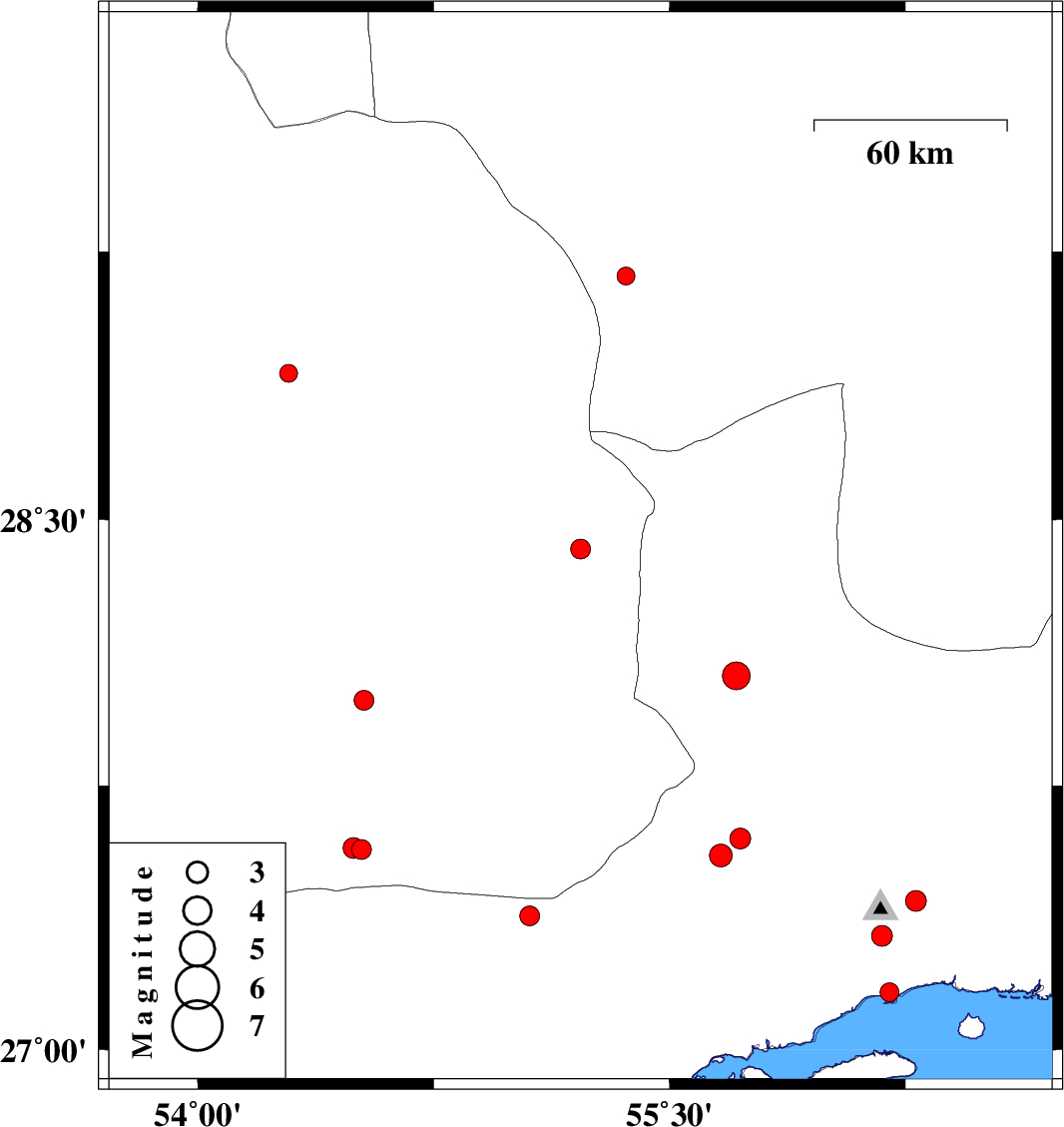 | 2017/11/07 | 11:37:54.9 | 15:07:54.9 | 27.574 | 54.495 | 14 | ML3 | Fars Province, 19 km South-East of Lar | ||