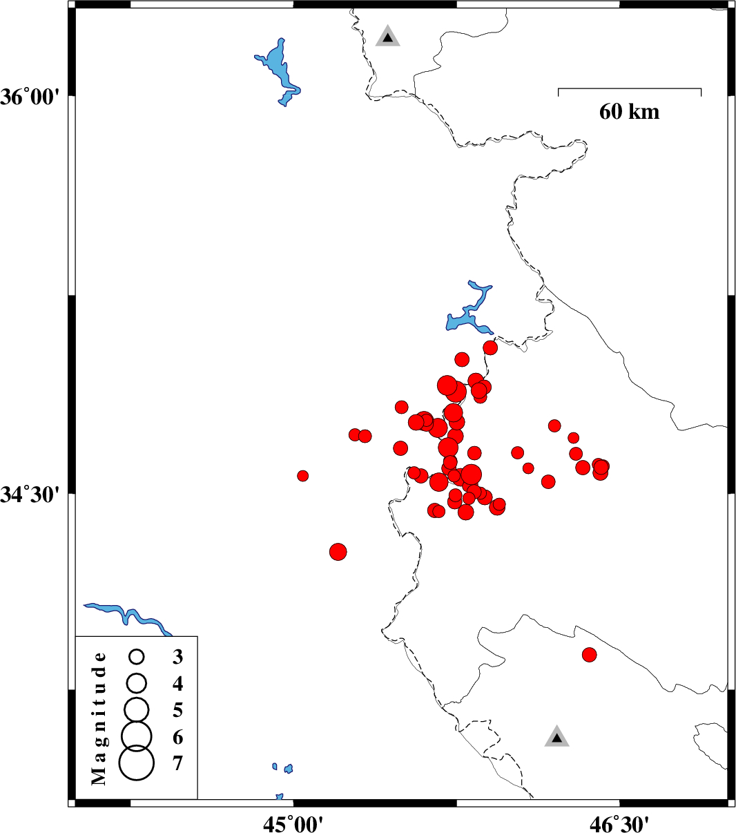 | 2017/11/23 | 14:00:14.8 | 17:30:14.8 | 34.468 | 45.741 | 14 | ML3 | Kermanshah Province, 14 km -West of Sar-e pol-e zahab | ||