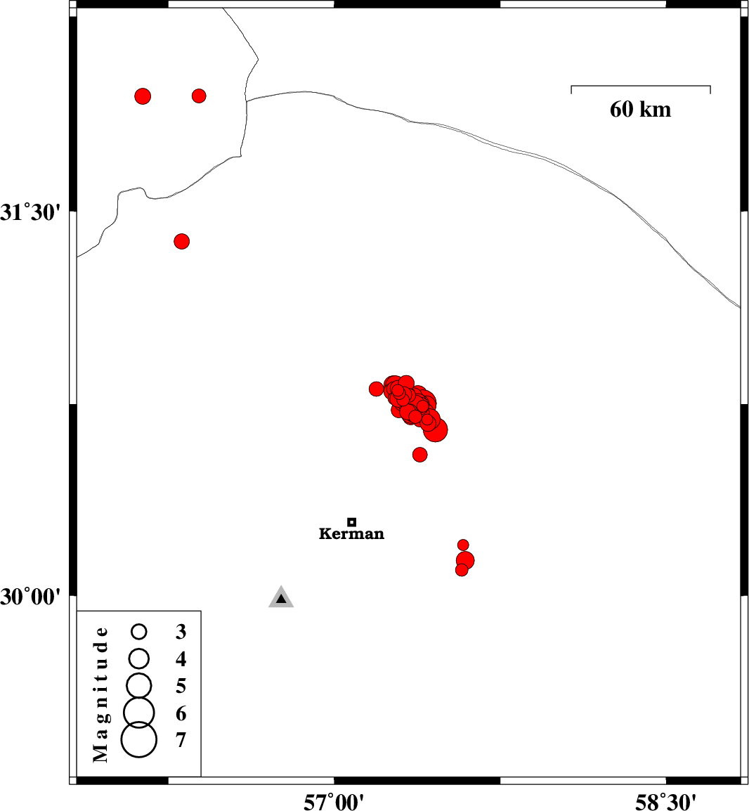 | 2017/11/19 | 13:13:29.1 | 16:43:29.1 | 30.691 | 57.408 | 14 | ML3.3 | Kerman Province, 55 km North-East of Kerman | ||