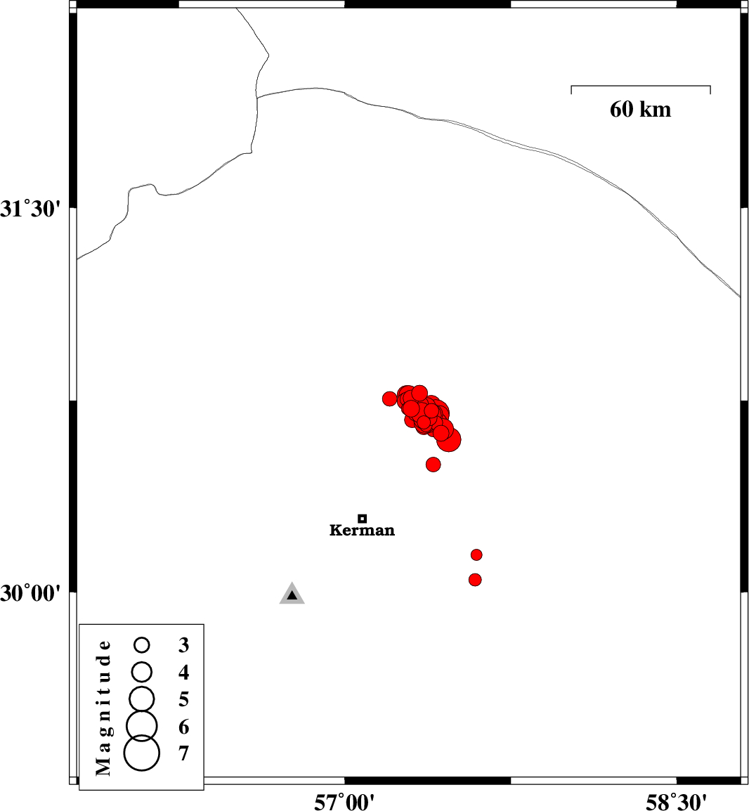 | 2017/11/27 | 01:56:22.0 | 05:26:22.0 | 30.1 | 57.576 | 14 | ML2.6 | Kerman Province, 52 km South-East of Kerman |