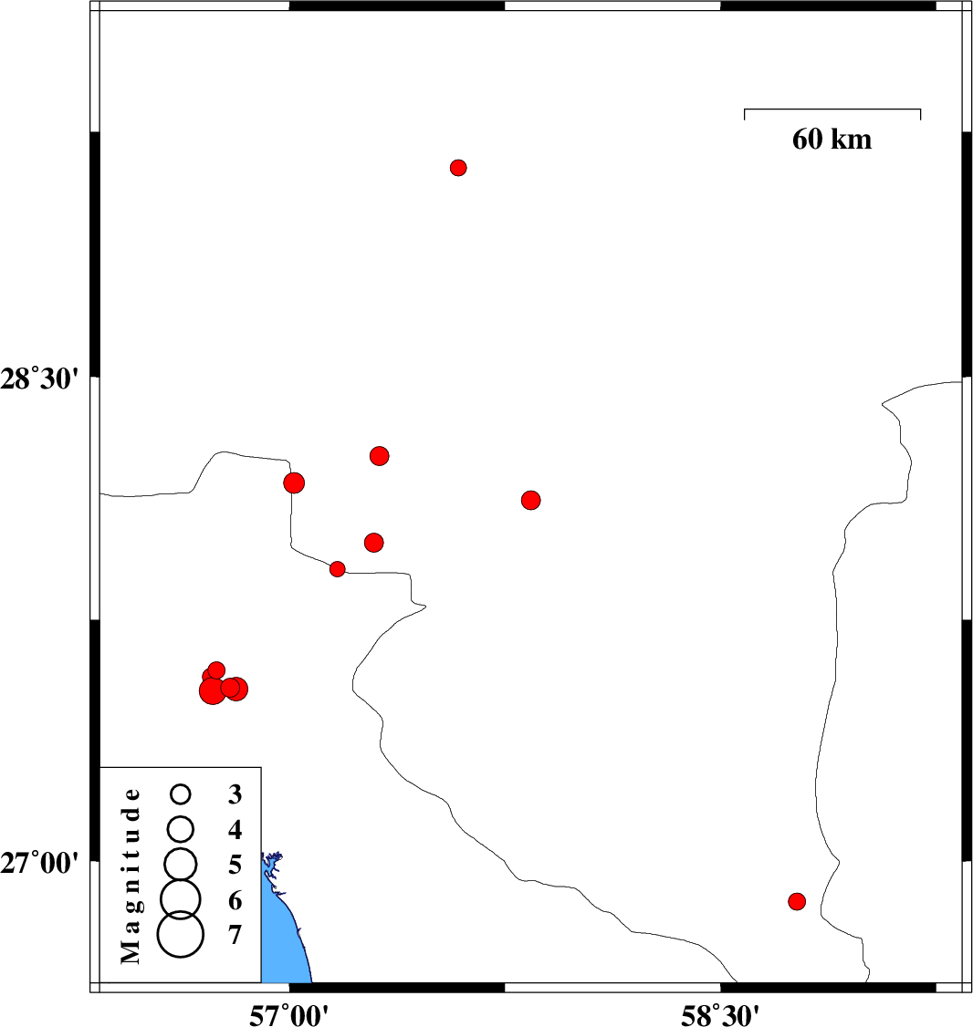 | 2017/12/04 | 18:46:17.8 | 22:16:17.8 | 28.12 | 57.84 | 14 | ML2.9 | Kerman Province, 24 km North-East of Kahnuj | ||