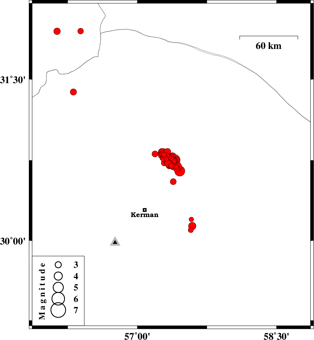 | 2017/11/19 | 13:13:29.1 | 16:43:29.1 | 30.691 | 57.408 | 14 | ML3.3 | Kerman Province, 55 km North-East of Kerman | ||