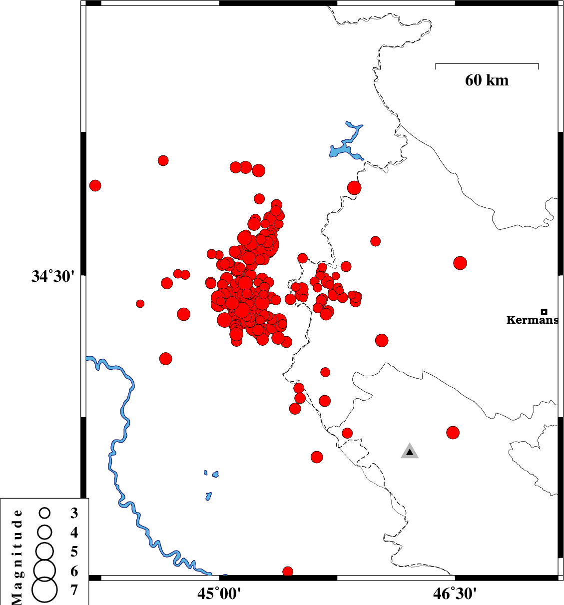 | 2017/11/23 | 14:00:14.8 | 17:30:14.8 | 34.468 | 45.741 | 14 | ML3 | Kermanshah Province, 14 km -West of Sar-e pol-e zahab | ||
