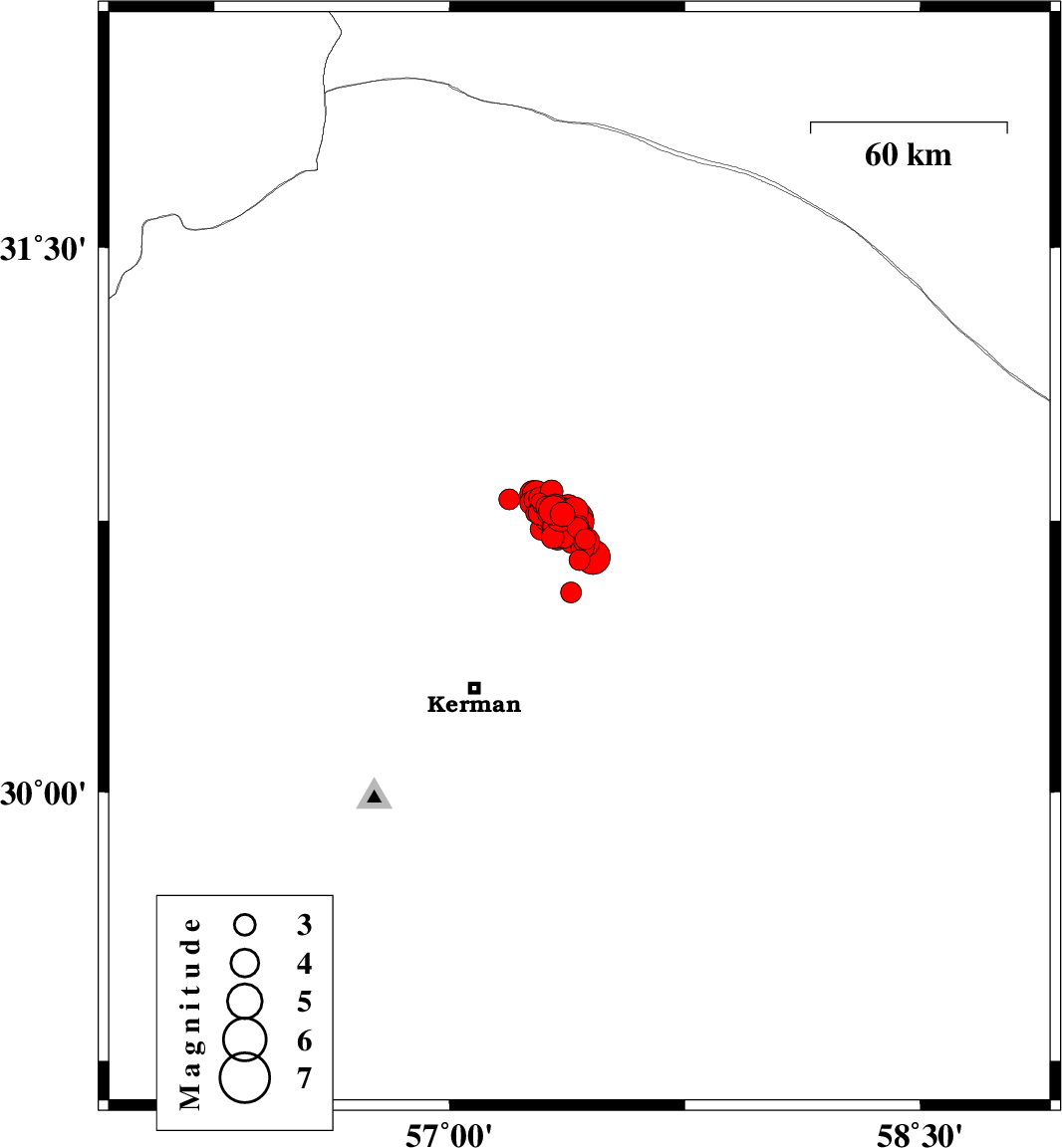 | 2017/12/06 | 01:29:51.4 | 04:59:51.4 | 30.777 | 57.399 | 14 | ML4 | Kerman Province, 62 km North-East of Kerman | ||