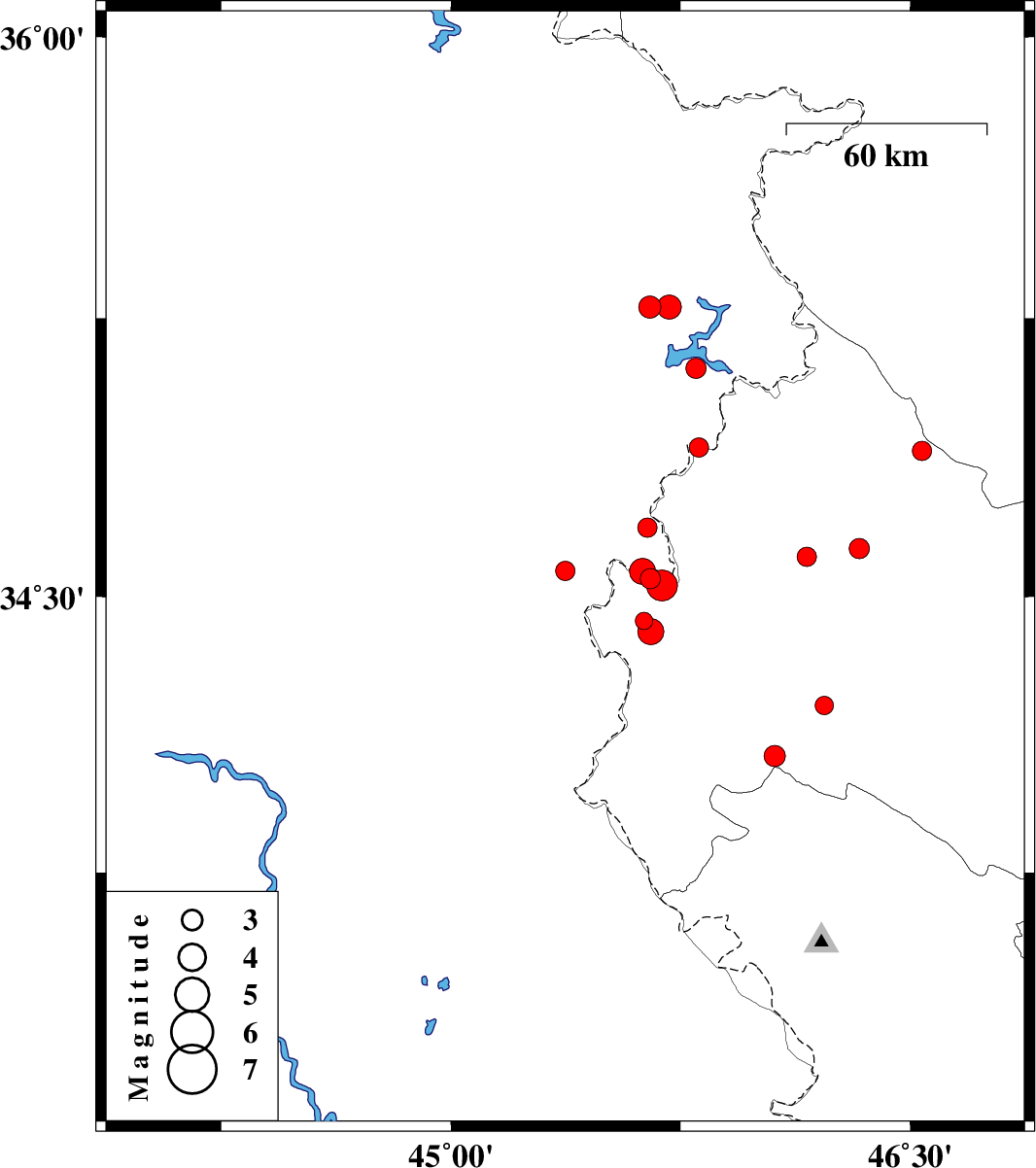 | 2017/12/09 | 06:40:31.3 | 10:10:31.3 | 34.608 | 46.162 | 6 | ML2.8 | Kermanshah Province, 30 km North-East of Sar-e pol-e zahab | ||