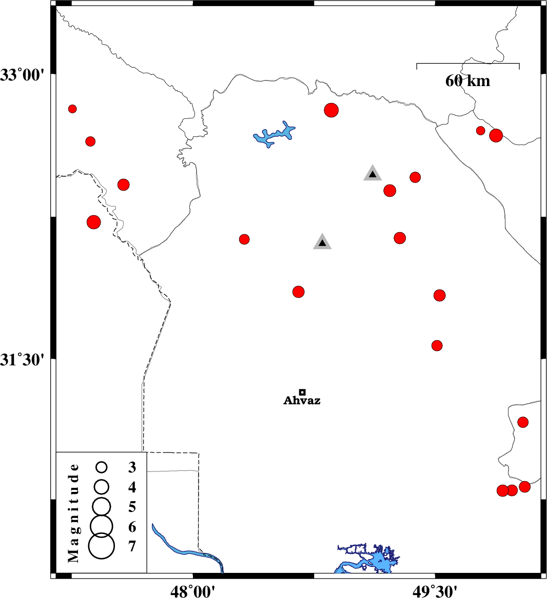 | 2017/11/27 | 18:54:23.9 | 22:24:23.9 | 30.798 | 49.974 | 15 | ML3.1 | Khoozestan Province, 26 km -East of Omidiyeh | ||