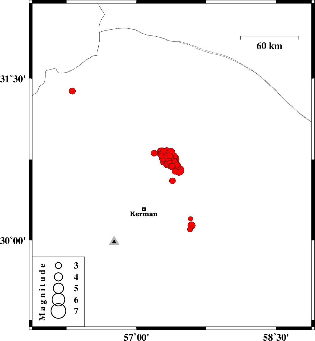 | 2017/12/06 | 01:29:51.4 | 04:59:51.4 | 30.777 | 57.399 | 14 | ML4 | Kerman Province, 62 km North-East of Kerman | ||