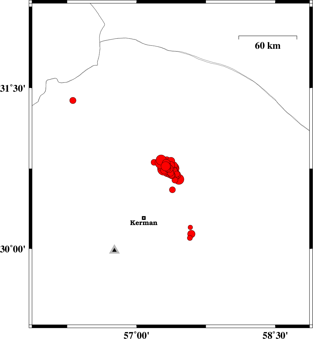 2017/12/01 | 03:51:31.8 | 07:21:31.8 | 30.744 | 57.415 | 14 | ML:3.9 | Kerman Province, 60 km North-East of Kerman | ||