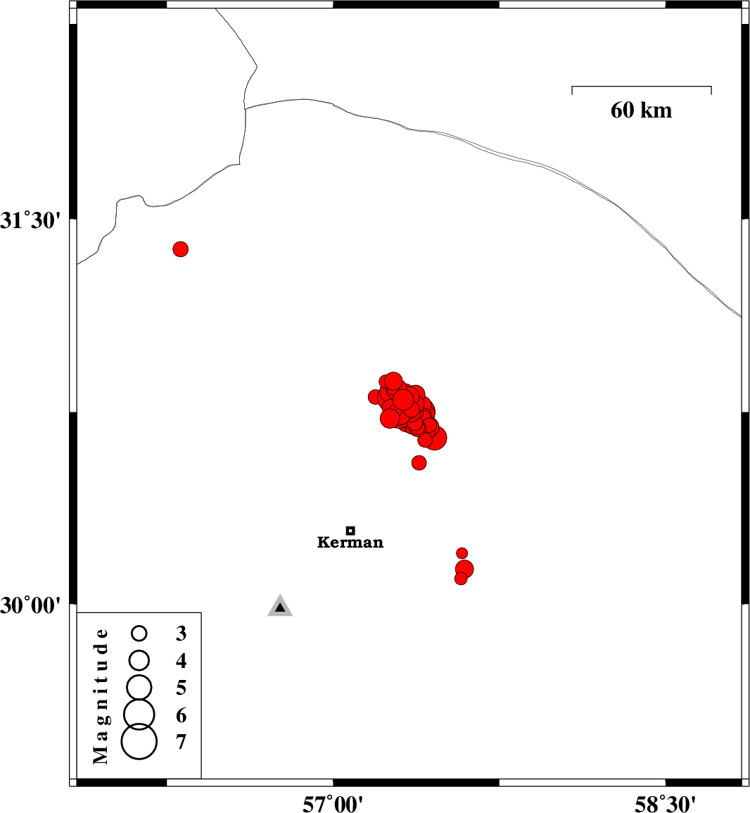 | 2017/12/12 | 10:26:26.1 | 13:56:26.1 | 30.774 | 57.293 | 14 | ML4 | Kerman Province, 58 km North-East of Kerman | ||