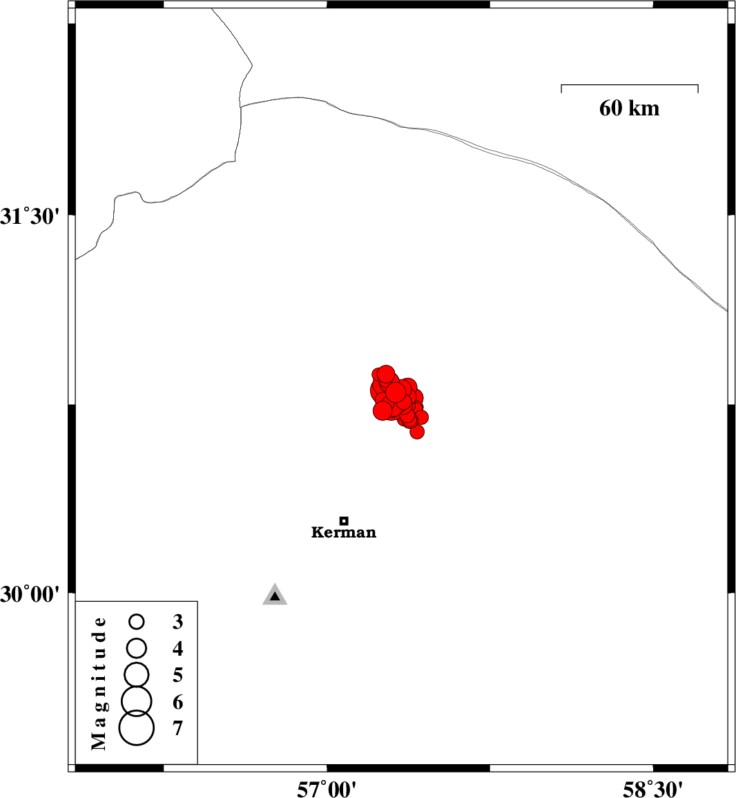 | 2017/12/12 | 10:26:26.1 | 13:56:26.1 | 30.774 | 57.293 | 14 | ML4 | Kerman Province, 58 km North-East of Kerman | ||