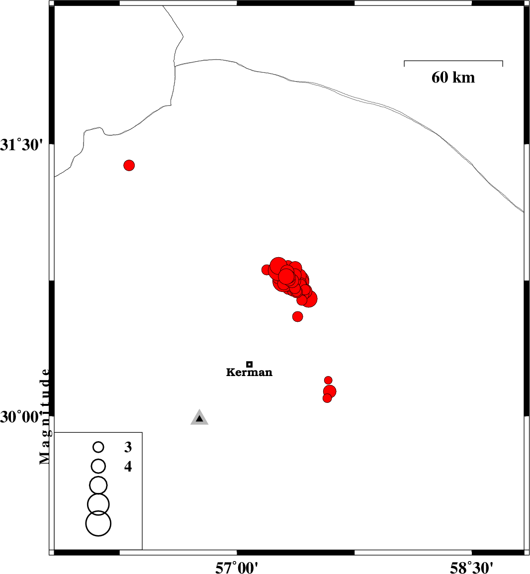 2017/12/12 | 09:17:52.6 | 12:47:52.6 | 30.75 | 57.323 | 14 | ML:3 | Kerman Province, 56 km North-East of Kerman | ||