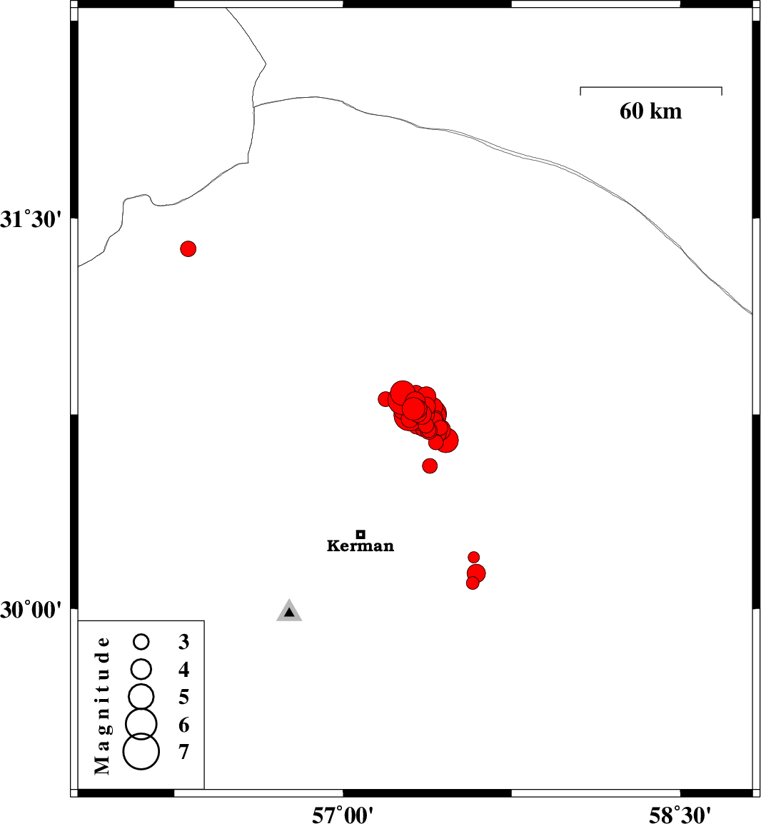 2017/12/02 10:50:40.4 14:20:40.4 30.75157.35615 ML4.1 Kerman Province, 58 km North-East of Kerman