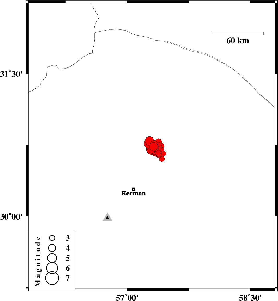 2017/12/12 23:05:34.8 02:35:34.8 30.77157.33214 ML3.6 Kerman Province, 59 km North-East of Kerman