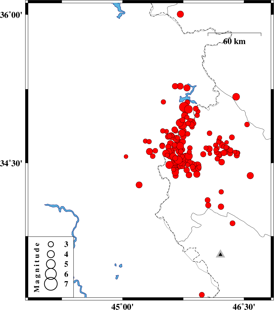 | 2017/12/09 | 06:40:31.3 | 10:10:31.3 | 34.608 | 46.162 | 6 | ML2.8 | Kermanshah Province, 30 km North-East of Sar-e pol-e zahab | ||